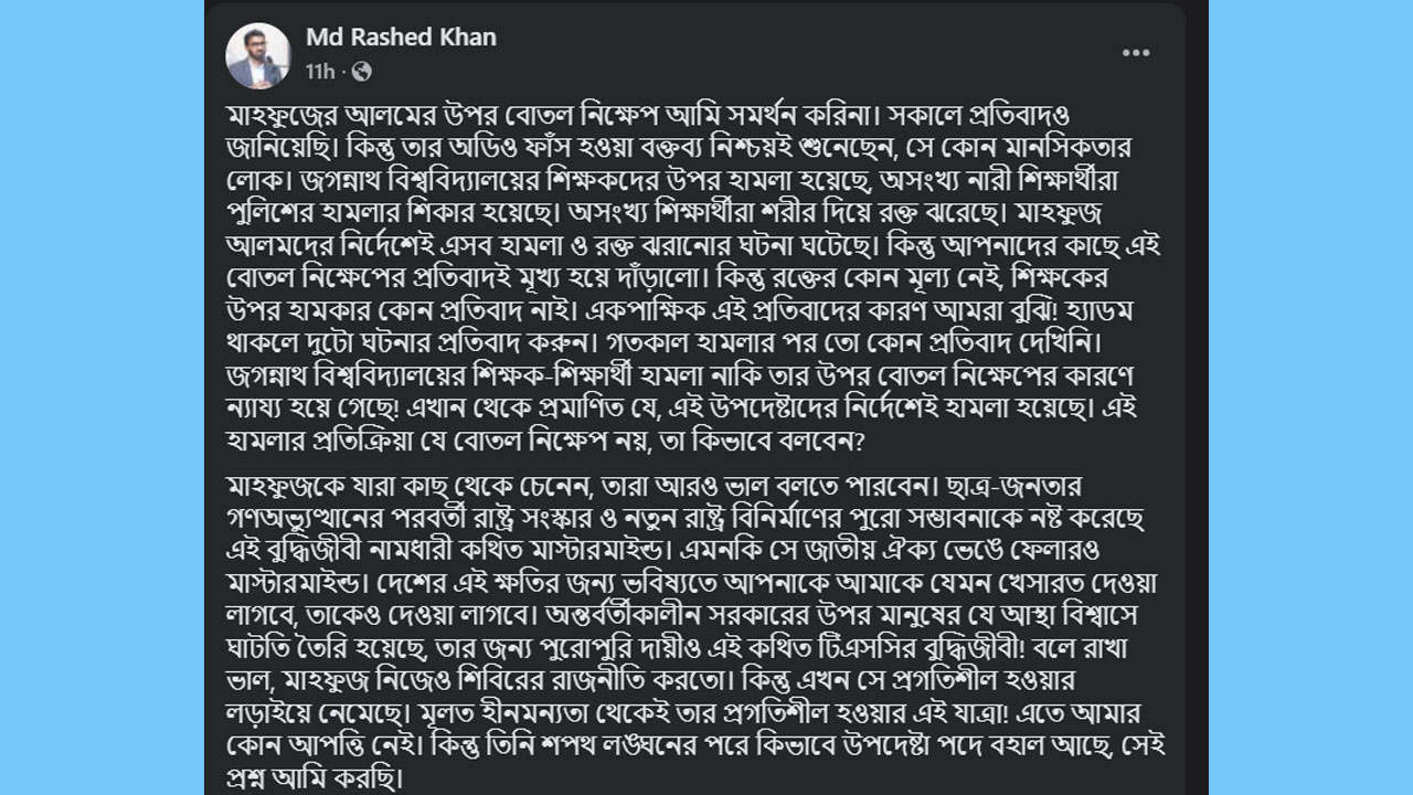 রাশেদ খান বলেন, ‘মাহফুজের আলমের ওপর বোতল নিক্ষেপ আমি সমর্থন করি না। সকালে প্রতিবাদও জানিয়েছি। কিন্তু তার অডিও ফাঁস হওয়া বক্তব্য নিশ্চয়ই শুনেছেন, সে কোন মানসিকতার লোক। জগন্নাথ বিশ্ববিদ্যালয়ের শিক্ষকদের ওপর হামলা হয়েছে, অসংখ্য নারী শিক্ষার্থীরা পুলিশের হামলার শিকার হয়েছে। অসংখ্য শিক্ষার্থীর শরীর দিয়ে রক্ত ঝরেছে। মাহফুজ আলমদের নির্দেশেই এসব হামলা ও রক্ত ঝরানোর ঘটনা ঘটেছে। কিন্তু আপনাদের কাছে এই বোতল নিক্ষেপের প্রতিবাদই মুখ্য হয়ে দাঁড়ালো।’