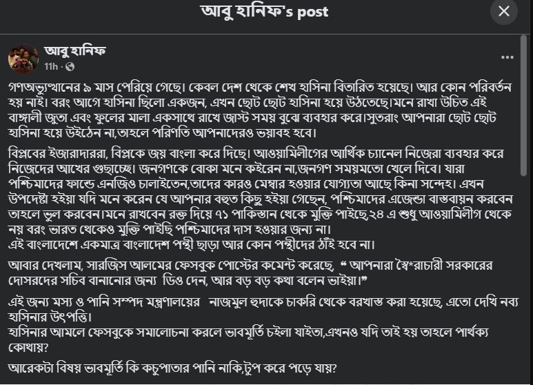 শনিবার রাত ১১টার দিকে একটি নিউজের ফটোপোস্ট শেয়ার করে ফেসবুকে নিজের আইডিতে দেওয়া এক স্ট্যাটাসে এসব কথা লেখেন আবু হানিফ।