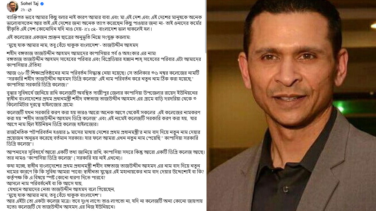 এ ছাড়া পোস্টে তিনি এই কলেজের একজন প্রাক্তন ছাত্রের অনুভূতিও যুক্ত করেছেন। যেখানে লেখা হয়েছে — ‘শহীদ বঙ্গতাজ তাজউদ্দীন আহমদ আমাদের কাপাসিয়ার গর্ব ও অহংকার এর নাম। বঙ্গতাজ তাজউদ্দীন আহমদ সাহেবের পরিবার এবং বিগ্রেডিয়ার হান্নান শাহ্ সাহেবের পরিবার এটা আমাদের কাপাসিয়ার ঐতিহ্য। আজ ৬৮টি শিক্ষাপ্রতিষ্ঠানের নাম পরিবর্তন সিদ্ধান্ত নেয়া হয়েছে। সে তালিকার ৩৬ নম্বর কলেজের নামটি ‘সরকারি শহীদ তাজউদ্দীন আহমদ ডিগ্রি কলেজ’ এই নাম পরিবর্তন করে নতুন নাম ঠিক করা হয়েছে, ‘কাপাসিয়া সরকারি ডিগ্রি কলেজ’।