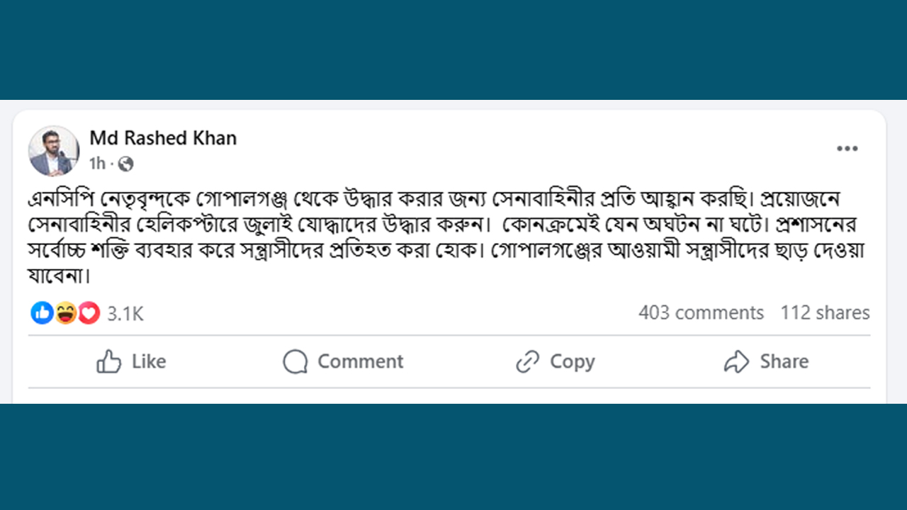 রাশেদ খান বলেন, এনসিপি নেতৃবৃন্দকে গোপালগঞ্জ থেকে উদ্ধার করার জন্য সেনাবাহিনীর প্রতি আহ্বান করছি। প্রয়োজনে সেনাবাহিনীর হেলিকপ্টারে জুলাই যোদ্ধাদের উদ্ধার করুন। কোনোক্রমেই যেন অঘটন না ঘটে।