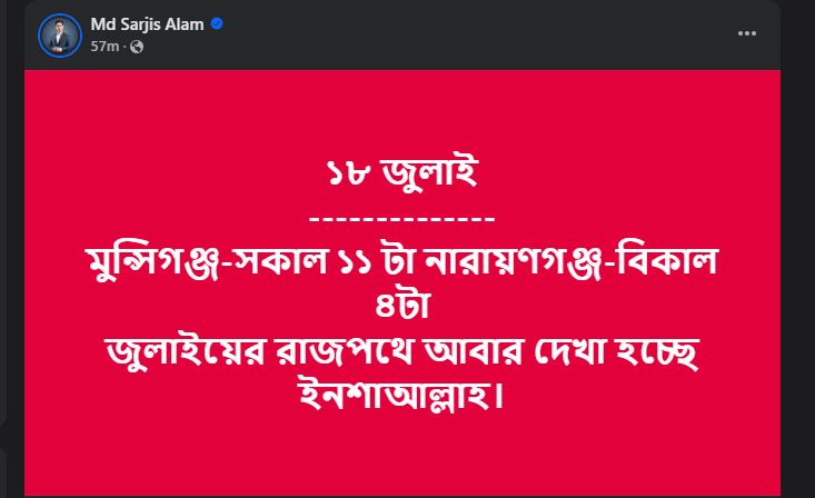 তিনি আরও বলেন, জুলাইয়ের রাজপথে আবার দেখা হচ্ছে ইনশাআল্লাহ।