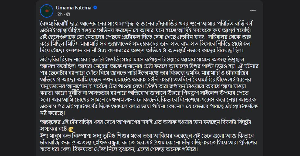 তিনি বৈষম্যবিরোধী ছাত্র আন্দোলনের কেন্দ্রীয় সমন্বয়ক ছিলেন। চাঁদাবাজির অভিযোগে বৈষম্যবিরোধী ছাত্র আন্দোলনের নেতাসহ পাঁচজন আটক হওয়ার ঘটনা নিয়ে উমামার ফেসবুক পোস্টটি তুলে ধরা হলো—