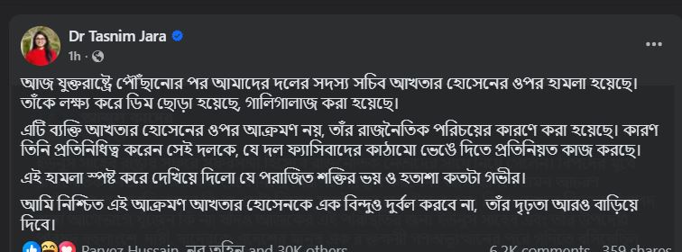 তিনি লিখেছেন, আজ যুক্তরাষ্ট্রে পৌঁছানোর পর আমাদের দলের সদস্য সচিব আখতার হোসেনের ওপর হামলা হয়েছে। তাকে লক্ষ্য করে ডিম ছোড়া হয়েছে, গালিগালাজ করা হয়েছে। এটি ব্যক্তি আখতার হোসেনের ওপর আক্রমণ নয়, তার রাজনৈতিক পরিচয়ের কারণে করা হয়েছে। কারণ, তিনি প্রতিনিধিত্ব করেন সেই দলকে, যে দল ফ্যাসিবাদের কাঠামো ভেঙে দিতে প্রতিনিয়ত কাজ করছে।