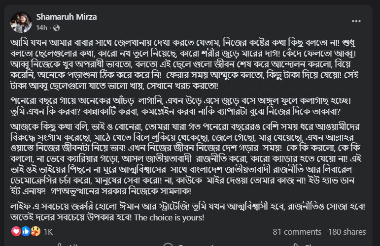 বাবার কারাজীবনের অভিজ্ঞতা ও দলের কর্মীদের প্রতি এক আবেগঘন বার্তা দিয়ে ফেসবুকে পোস্ট করেছেন বিএনপি মহাসচিব মির্জা ফখরুল ইসলাম আলমগীরের মেয়ে শামারুহ মির্জা। পোস্টে তিনি একদিকে যেমন ত্যাগী নেতাকর্মীদের প্রতি সহানুভূতি জানিয়েছেন, তেমনি অন্যদিকে দলের কর্মীদেরকে অতীতের সংঘাতপূর্ণ রাজনীতি থেকে সরে এসে ব্যক্তিগত জীবন গড়া এবং উদার গণতান্ত্রিক (লিবারেল ডেমোক্রেসির) রাজনীতি চর্চার আহ্বান জানিয়েছেন।