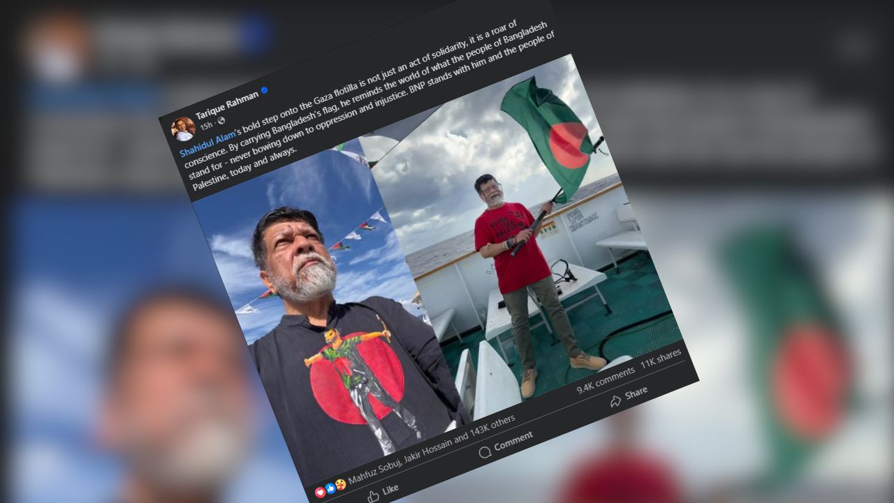 তারেক রহমান লেখেন, গাজা অভিমুখী ফ্লোটিলায় শহিদুল আলমের অংশগ্রহণ শুধু সংহতির প্রকাশ নয়, এটি ন্যায়ের পক্ষে বিবেকের শক্তিশালী উচ্চারণ। বাংলাদেশের পতাকা তুলে ধরে তিনি প্রমাণ করেছেন, এই জাতি কখনো নিপীড়ন ও অবিচারের কাছে মাথা নত করেনি এবং করবে না।