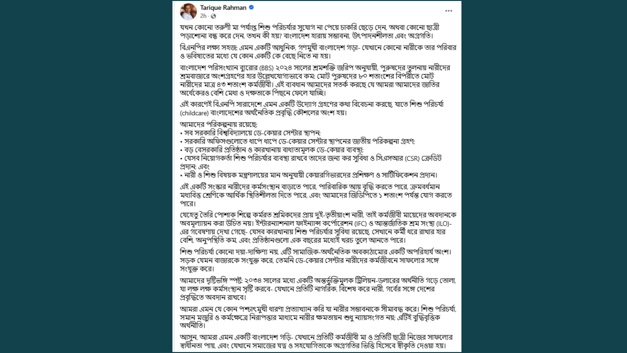তারেক রহমান বলেন, ‘যখন কোনো তরুণী মা পর্যাপ্ত শিশু পরিচর্যার সুযোগ না পেয়ে চাকরি ছেড়ে দেন, অথবা কোনো ছাত্রী পড়াশোনা বন্ধ করে দেন, তখন কী হয়? বাংলাদেশ হারায় সম্ভাবনা, উৎপাদনশীলতা এবং অগ্রগতি।’