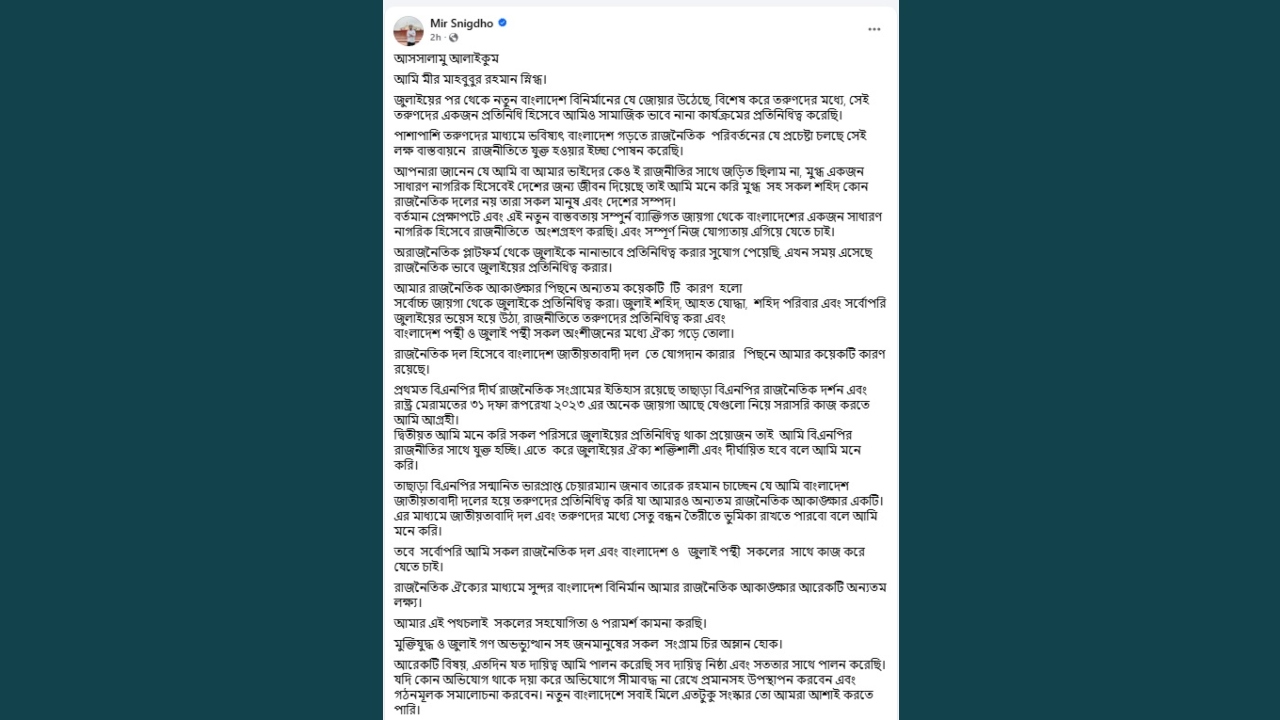 জুলাই গণঅভ্যুত্থানে শহীদ মীর মুগ্ধের যমজ ভাই মীর মাহবুবুর রহমান স্নিগ্ধ গত ৪ নভেম্বর আনুষ্ঠানিকভাবে বিএনপিতে যোগ দিয়েছেন।