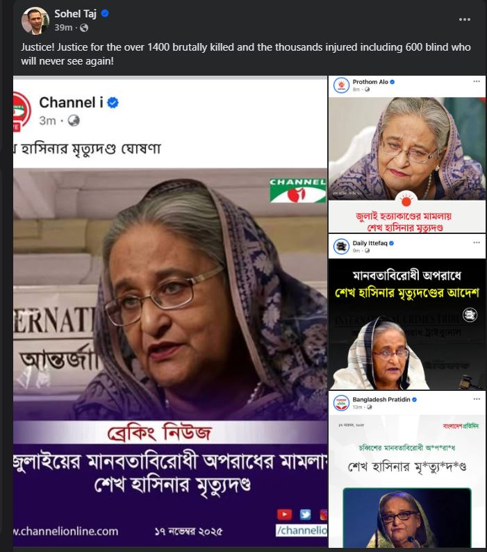 রায় ঘোষণার পরপরই বিগত আওয়ামী লীগ সরকারের সাবেক স্বরাষ্ট্র প্রতিমন্ত্রী সোহেল তাজ সোমবার (১৭ নভেম্বর) নিজের ভেরিফায়েড ফেসবুক পেজে একটি পোস্ট দিয়েছেন। এর সঙ্গে কয়েকটি গণমাধ্যমের ব্রেকিং নিউজের পোস্টার জুড়ে দিয়েছেন। যেখানে লেখা ছিল— জুলাইয়ের মানবতা বিরোধী অপরাধের মামলায় শেখ হাসিনার মৃত্যুদণ্ড।