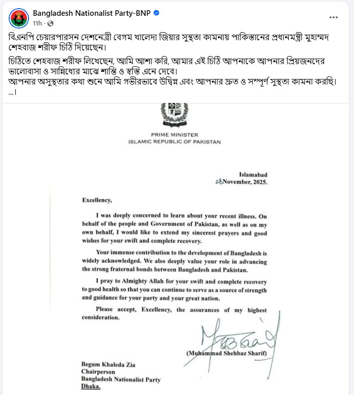 শনিবার (২৯ নভেম্বর) রাতে বিএনপির ভেরিফায়েড ফেসবুক পেজে চিঠিটি পোস্ট করা হয়।