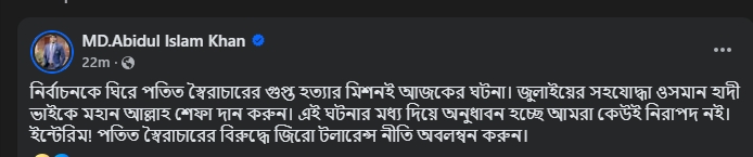 তিনি লিখেছেন, নির্বাচনকে ঘিরে পতিত স্বৈরাচারের গুপ্ত হত্যার মিশনই আজকের ঘটনা। জুলাইয়ের সহযোদ্ধা ওসমান হাদী ভাইকে মহান আল্লাহ শেফা দান করুন।