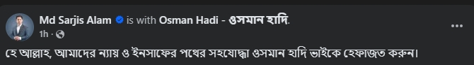 শুক্রবার বিকেল পৌনে ৩টায় ফেসবুকে নিজের ভেরিফায়েড পেজে দেওয়া এক পোস্টে তিনি বলেন, হে আল্লাহ, আমাদের ন্যায় ও ইনসাফের পথের সহযোদ্ধা ওসমান হাদি ভাইকে হেফাজত করুন।