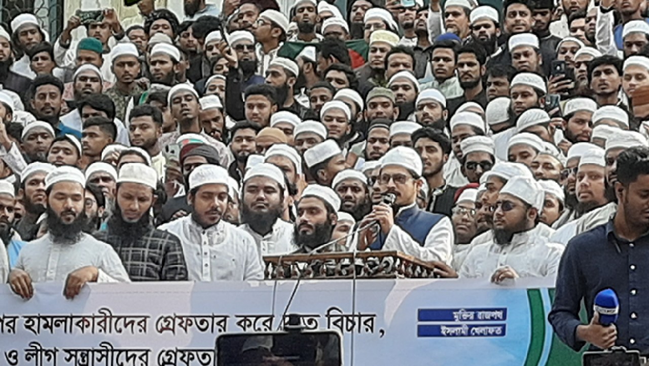 শুক্রবার (১৯ ডিসেম্বর) জুম্মার নামাজ শেষে জাতীয় মসজিদ বায়তুল মোকাররমে ‘শরিফ ওসমান হাদির ওপর হামলাকারীদের গ্রেপ্তার করে দ্রুত বিচার, অবৈধ অস্ত্র উদ্ধার ও লীগ সন্ত্রাসীদের গ্রেপ্তারের দাবিতে’ শীর্ষক ব্যানারে বিক্ষোভ কর্মসূচি শুরু করে বাংলাদেশ খেলাফত ছাত্র মজলিস। বিক্ষোভ মিছিল থেকে তিনি এ দাবি করেন।