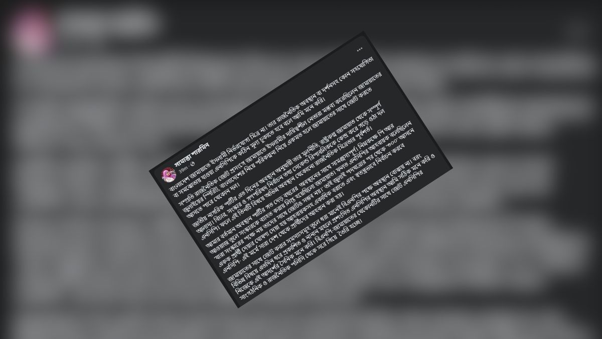 পোস্টে তিনি এনসিপির রাজনৈতিক আদর্শ ও বর্তমান প্রেক্ষাপট তুলে ধরে জামায়াতের সঙ্গে জোটবদ্ধ হওয়ার বিরোধিতা করেন।