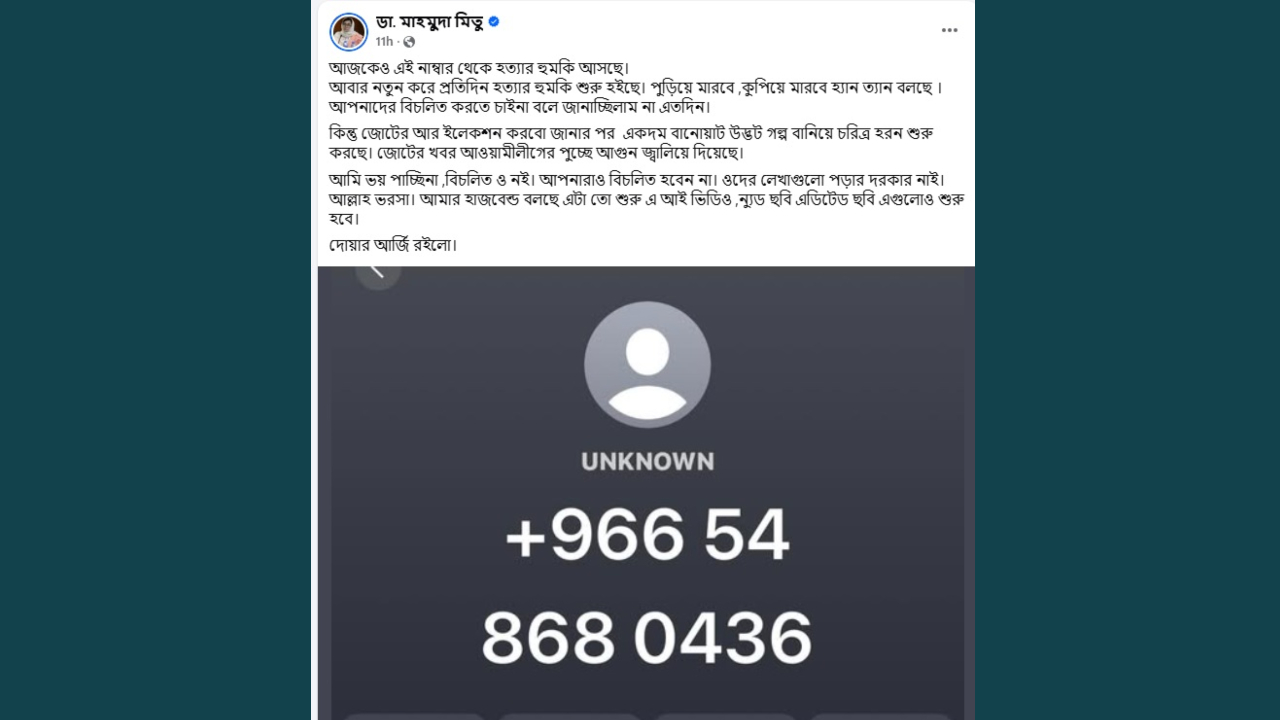 ফেসবুক পোস্টে ডা. মাহমুদা মিতু অভিযোগ করেন, একটি নির্দিষ্ট মোবাইল নম্বর থেকে তাকে নিয়মিত প্রাণনাশের হুমকি দেওয়া হচ্ছে। হুমকিদাতারা তাকে পুড়িয়ে কিংবা কুপিয়ে হত্যার মতো ভয়ংকর ভাষা ব্যবহার করছে বলেও তিনি উল্লেখ করেন। দীর্ঘদিন এসব হুমকির কথা প্রকাশ না করলেও সাম্প্রতিক রাজনৈতিক জোট গঠন ও নির্বাচনে অংশ নেওয়ার সিদ্ধান্ত প্রকাশের পর তার বিরুদ্ধে উদ্দেশ্যপ্রণোদিতভাবে হুমকি ও চরিত্রহননের অপচেষ্টা শুরু হয়েছে বলে দাবি করেন তিনি।