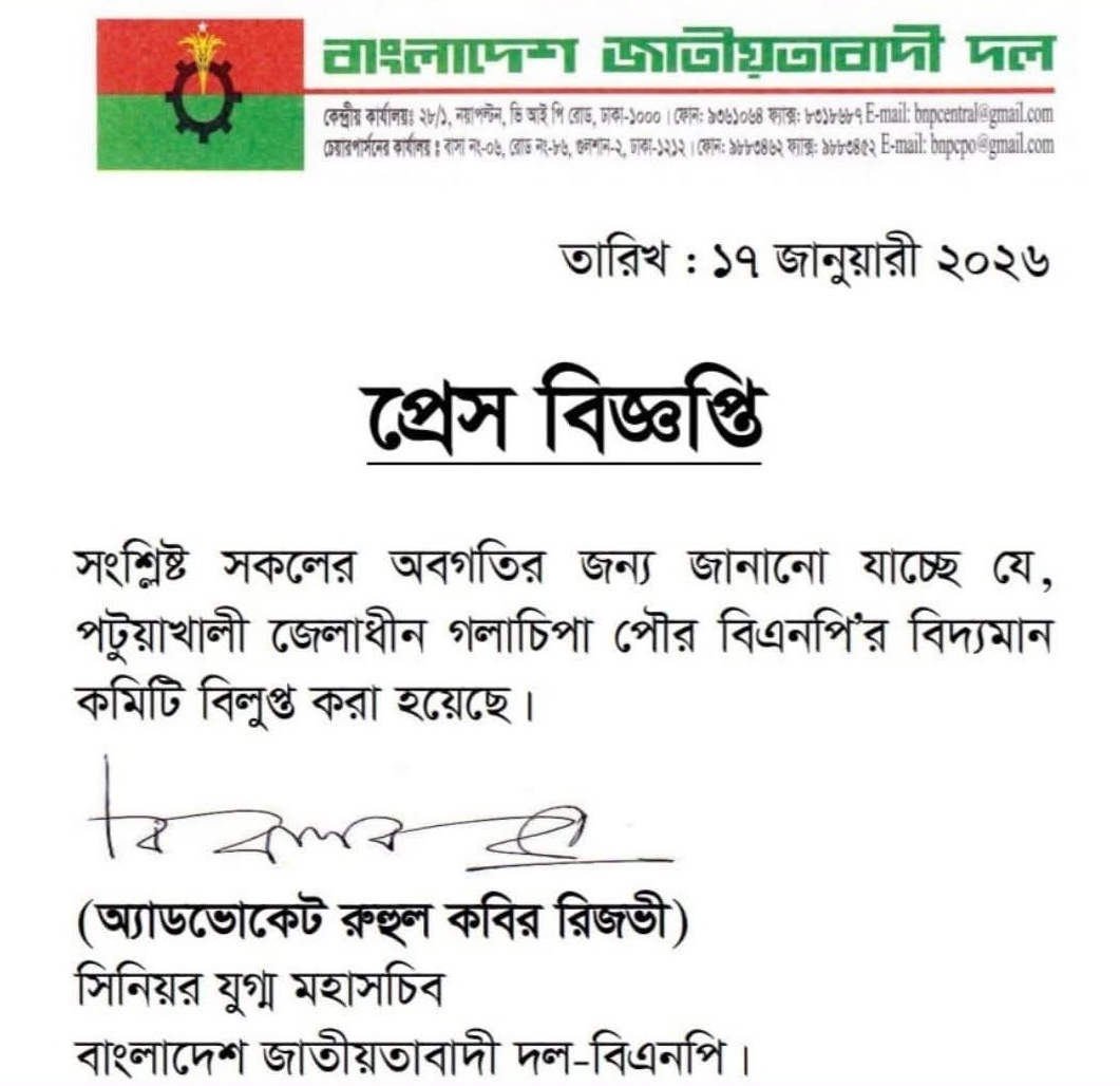 বিবৃতিতে গলাচিপা ও দশমিনা উপজেলা বিএনপির সাংগঠনিক কমিটি বিলুপ্তির বিষয়টি জানানো হয়। পরবর্তীতে পৃথক এক প্রেস বিজ্ঞপ্তিতে গলাচিপা পৌর বিএনপির কমিটিও বিলুপ্ত ঘোষণা করা হয়।