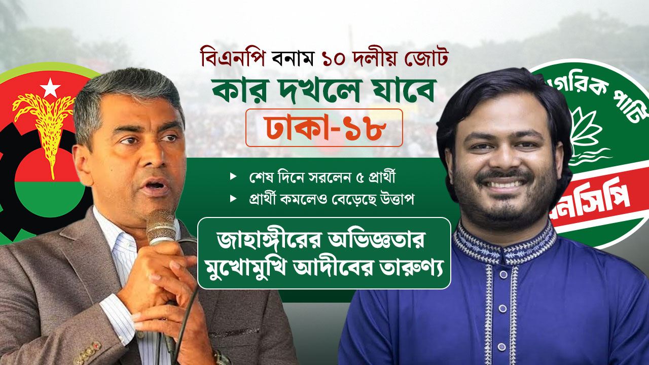 সার্বিক প্রেক্ষাপটে ঢাকা-১৮ আসনের নির্বাচনী লড়াই এখন কার্যত দ্বিমুখী প্রতিদ্বন্দ্বিতার দিকে মোড় নিয়েছে। একদিকে রয়েছেন বিএনপির হেভিওয়েট প্রার্থী এস এম জাহাঙ্গীর হোসেন, অন্যদিকে রয়েছেন জাতীয় নাগরিক পার্টির (এনসিপি) প্রার্থী আরিফুল ইসলাম আদীব— যিনি জামায়াতে ইসলামীসহ বেশ কিছু সমমনা রাজনৈতিক দলের সক্রিয় সমর্থন পাচ্ছেন। উভয়পক্ষ জয়ের ব্যাপারে শতভাগ আশাবাদী এবং নিজেদের অবস্থান সুসংহত বলে দাবি করছে।
