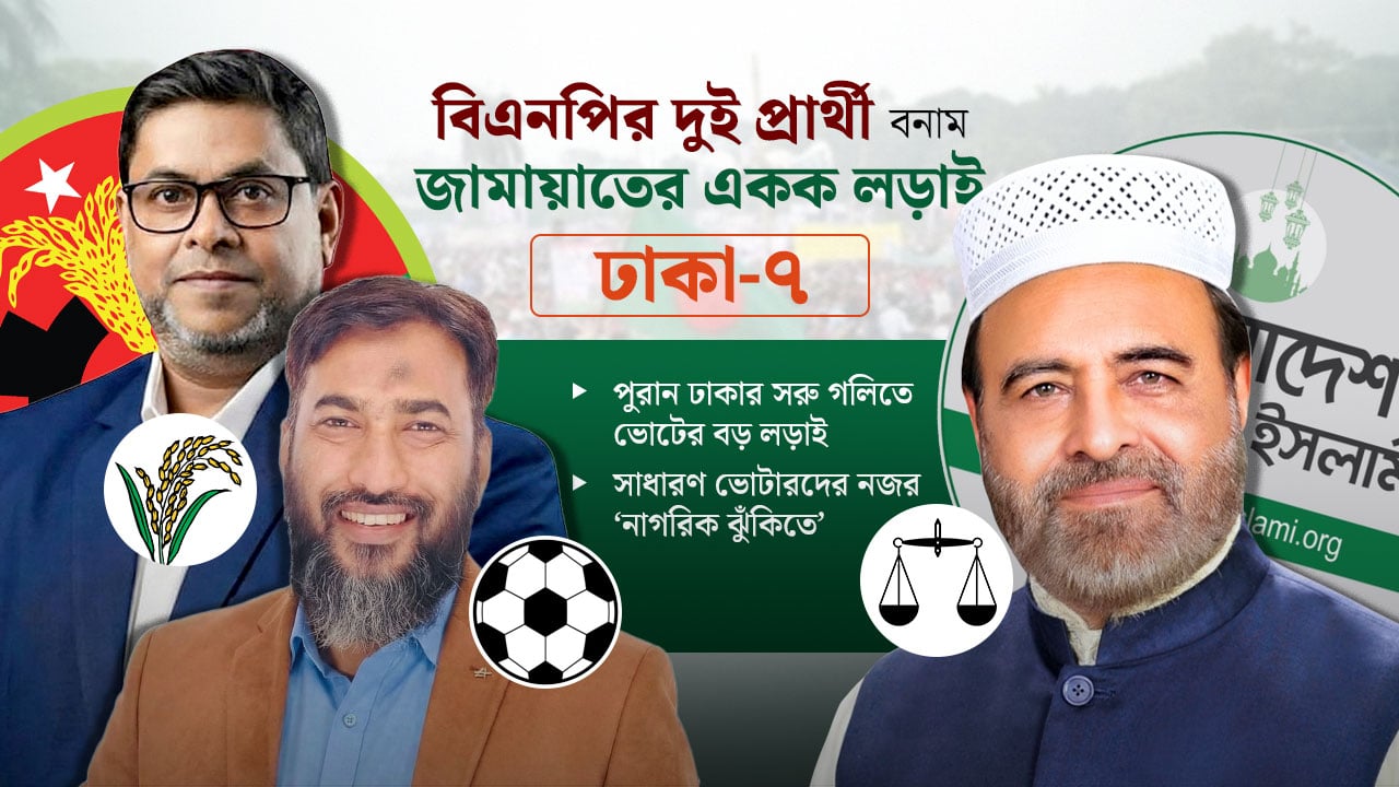 আসন্ন ত্রয়োদশ জাতীয় সংসদ নির্বাচনে ঢাকা-৭ আসনে ত্রিমুখী লড়াইয়ের আভাস পাওয়া যাচ্ছে। এই আসনে বিএনপির মনোনীত প্রার্থীর পাশাপাশি দলটির এক নেতা স্বতন্ত্র প্রার্থী হিসেবে মাঠে রয়েছেন। অন্যদিকে, জোটগত কারণে এনসিপি প্রার্থী সরে দাঁড়ানোয় জামায়াতে ইসলামী একক প্রার্থী নিয়ে সুবিধাজনক অবস্থানে আছে। পাশাপাশি ইসলামী আন্দোলনের প্রার্থীও মাঠ চষে বেড়াচ্ছেন।