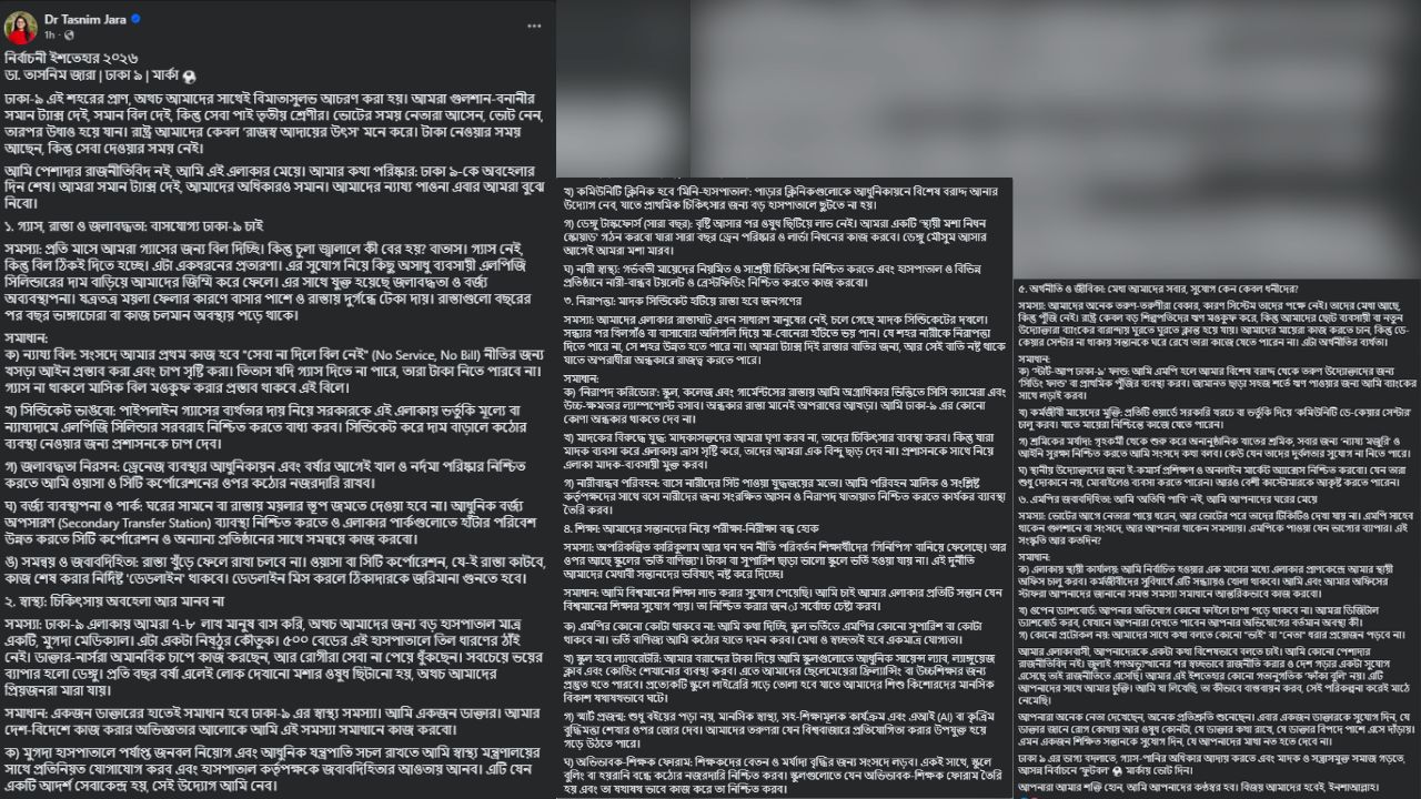 ‘ঢাকা-৯ এই শহরের প্রাণ, অথচ আমাদের সাথেই বিমাতাসুলভ আচরণ করা হয়। আমরা গুলশান-বনানীর সমান ট্যাক্স দিই, সমান বিল দিই, কিন্তু সেবা পাই তৃতীয় শ্রেণির।’–এমন বার্তায় নিজের নির্বাচনী ইশতেহার ঘোষণা করেছেন ঢাকা-৯ আসনের স্বতন্ত্র প্রার্থী ডা. তাসনিম জারা। নিজেকে ‘ঘরের মেয়ে’ দাবি করে তিনি সাফ জানিয়ে দিয়েছেন, “আমি ‘অতিথি পাখি’ নই, আমি আপনাদের ঘরের মেয়ে।”