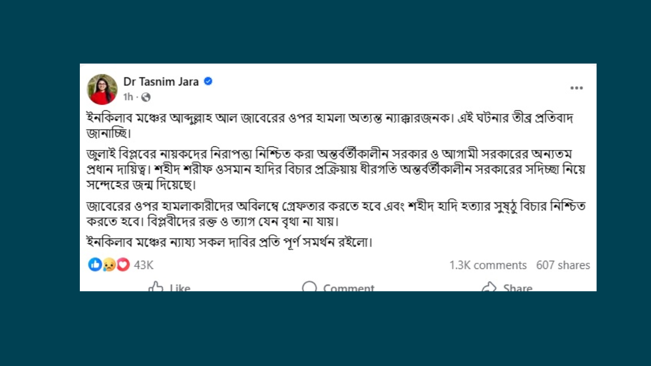 তাসনিম জারা তার স্ট্যাটাসে লেখেন, ইনকিলাব মঞ্চের আব্দুল্লাহ আল জাবেরের ওপর হামলা অত্যন্ত ন্যক্কারজনক। এই ঘটনার তীব্র প্রতিবাদ জানাচ্ছি। জুলাই বিপ্লবের নায়কদের নিরাপত্তা নিশ্চিত করা অন্তর্বর্তী সরকার ও আগামী সরকারের অন্যতম প্রধান দায়িত্ব। শহীদ শরীফ ওসমান হাদির বিচার প্রক্রিয়ায় ধীরগতি অন্তর্বর্তী সরকারের সদিচ্ছা নিয়ে সন্দেহের জন্ম দিয়েছে।