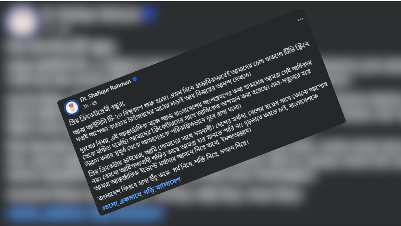 ডা. শফিকুর রহমান তার পোস্টে বলেন, আইসিসি টি-টোয়েন্টি বিশ্বকাপের মতো বড় আসর শুরু হওয়ার দিনে স্বাভাবিকভাবেই দেশের মানুষের চোখ থাকার কথা ছিল টিভি পর্দায়। টাইগারদের মাঠের লড়াই আর লাল-সবুজের উল্লাস দেখার অপেক্ষায় থাকার কথা ছিল কোটি ক্রিকেটপ্রেমীর। কিন্তু দুর্ভাগ্যজনকভাবে সেই অধিকার থেকে বাংলাদেশকে বঞ্চিত করা হয়েছে।