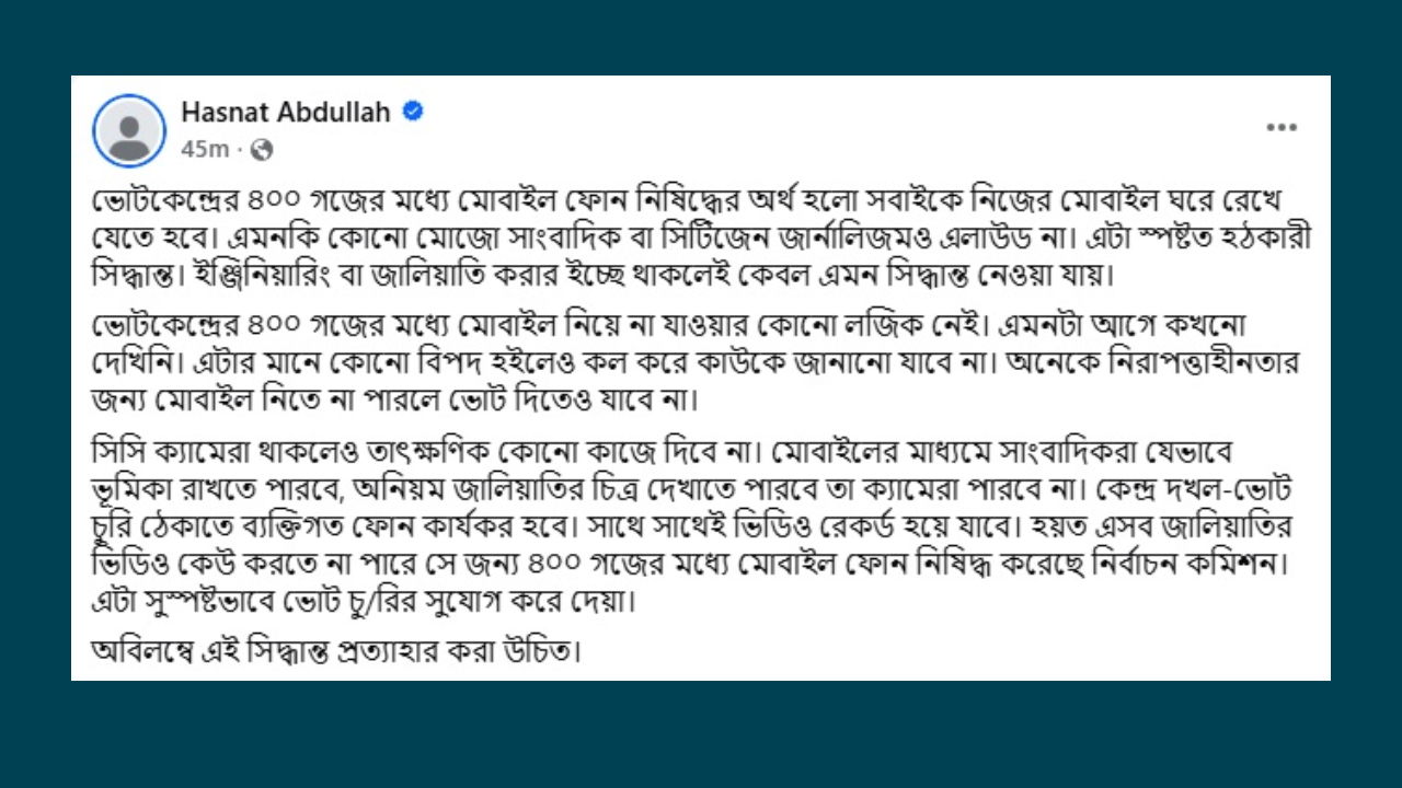 হাসনাত আব্দুল্লাহ লিখেন, সিসি ক্যামেরা থাকলেও তাৎক্ষণিক কোনো কাজে দিবে না। মোবাইলের মাধ্যমে সাংবাদিকরা যেভাবে ভূমিকা রাখতে পারবে, অনিয়ম জালিয়াতির চিত্র দেখাতে পারবে তা ক্যামেরা পারবে না। কেন্দ্র দখল-ভোট চুরি ঠেকাতে ব্যক্তিগত ফোন কার্যকর হবে। সাথে সাথেই ভিডিও রেকর্ড হয়ে যাবে। হয়ত এসব জালিয়াতির ভিডিও কেউ করতে না পারে সে জন্য ৪০০ গজের মধ্যে মোবাইল ফোন নিষিদ্ধ করেছে নির্বাচন কমিশন। এটা সুস্পষ্টভাবে ভোট চু/রির সুযোগ করে দেয়া। অবিলম্বে এই সিদ্ধান্ত প্রত্যাহার করা উচিত।