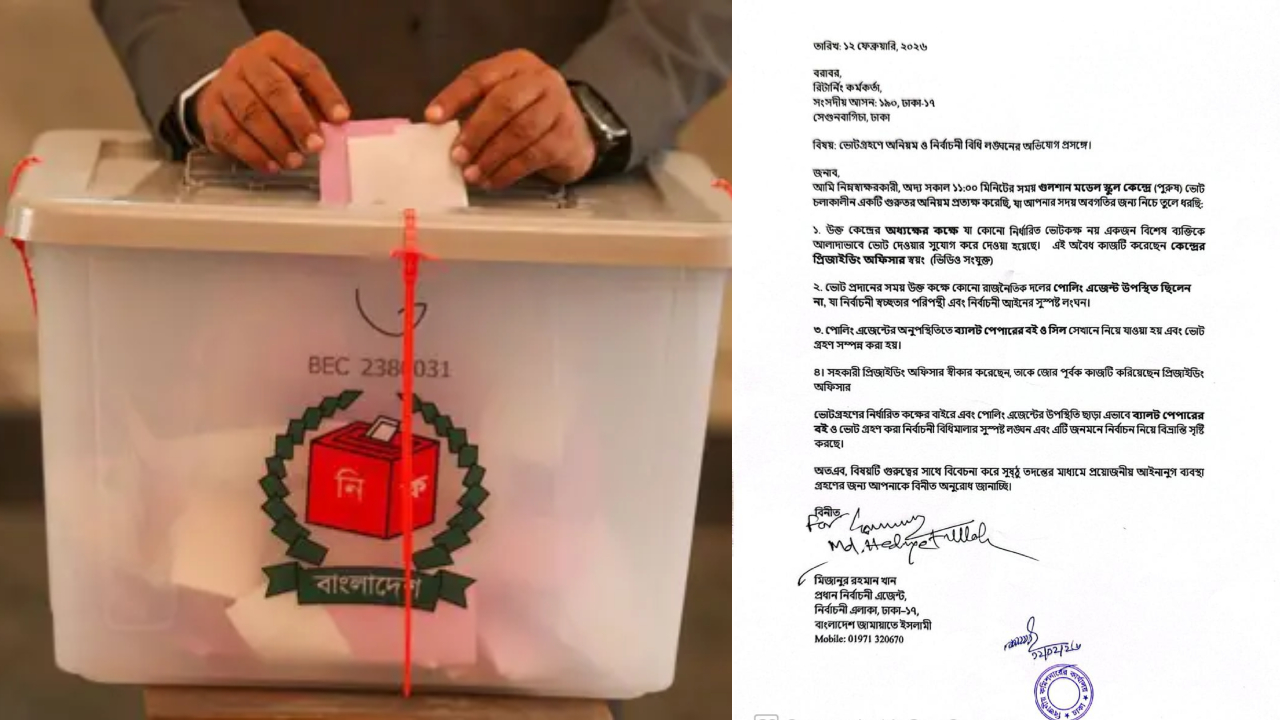 এতে আরও বলা হয়, ভোট প্রদানের সময় ওই কক্ষে কোনো রাজনৈতিক দলের পোলিং এজেন্ট উপস্থিত ছিলেন না। যা নির্বাচনী স্বচ্ছতার পরিপন্থি ও আইনের সুস্পষ্ট লঙ্ঘন। পোলিং এজেন্টের অনুপস্থিতিতে ব্যালট পেপারের বই ও সিল সেখানে নিয়ে যাওয়া হয় এবং ভোটগ্রহণ সম্পন্ন করা হয়। এছাড়া সহকারী প্রিজাইডিং কর্মকর্তা স্বীকার করেছেন যে, তাকে জোর পূর্বক কাজটি করিয়েছেন প্রিজাইডিং কর্মকর্তা।