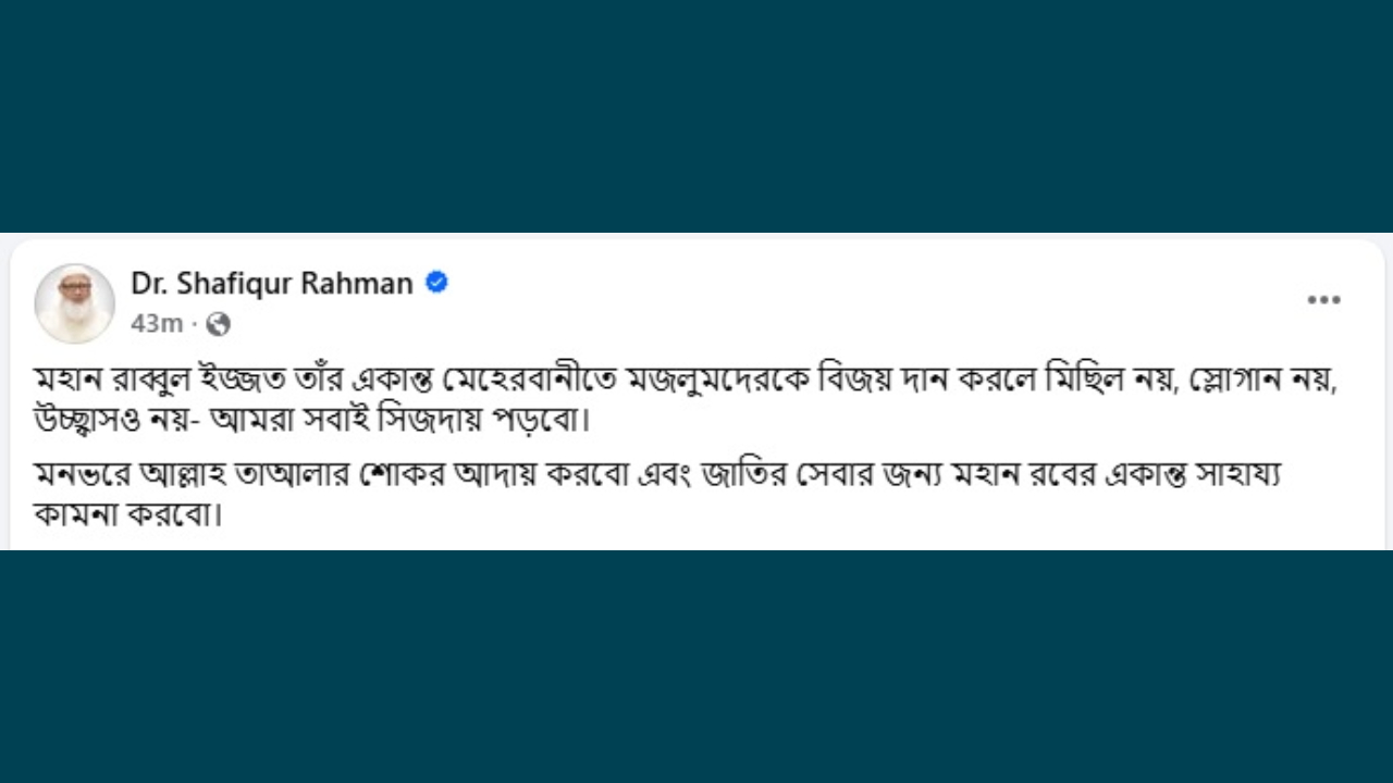 শফিকুর রহমান লিখেছেন, মহান রাব্বুল ইজ্জত তার একান্ত মেহেরবানীতে মজলুমদেরকে বিজয় দান করলে মিছিল নয়, স্লোগান নয়, উচ্ছ্বাসও নয়; আমরা সবাই সিজদায় পড়বো। মনভরে আল্লাহ তাআলার শোকর আদায় করব এবং জাতির সেবার জন্য মহান রবের একান্ত সাহায্য কামনা করব।