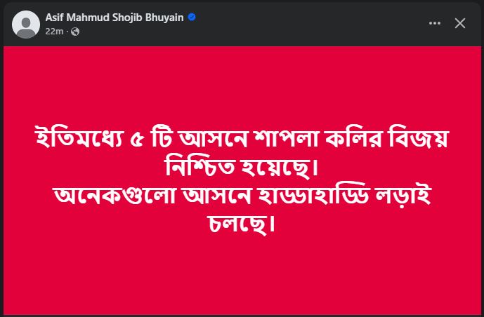 আসিফ মাহমুদ লিখেছেন, ইতোমধ্যে ৫টি আসনে শাপলা কলির বিজয় নিশ্চিত হয়েছে। অনেকগুলো আসনে হাড্ডাহাড্ডি লড়াই চলছে।
