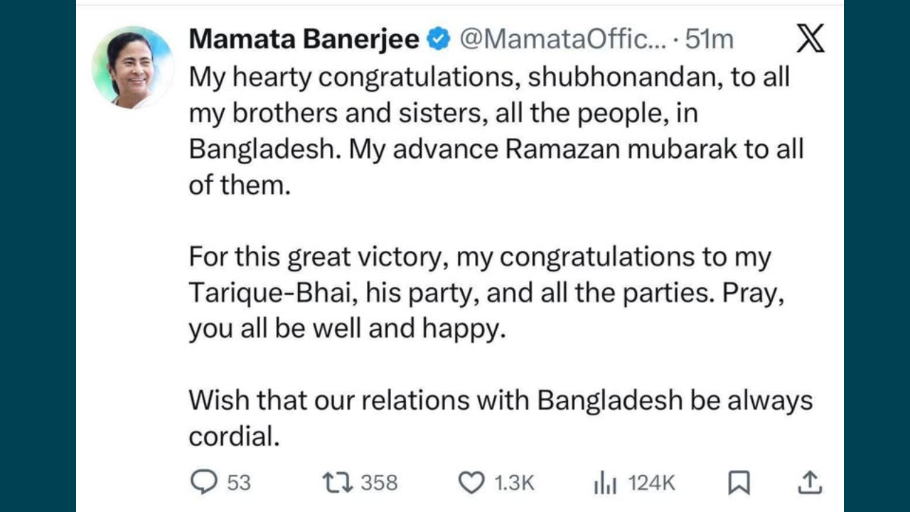 মমতা বন্দ্যোপাধ্যায় বলেন, বাংলাদেশের সকল ভাইবোনকে, জনগণকে জানাই আমার শুভনন্দন, আমার আগাম রমজান মোবারক। বাংলাদেশের এই বিপুল জয়ের জন্য অভিনন্দন জানাই আমার তারেক ভাইকে, তার দলকে ও অন্যান্য দলকে। সবাই ভালো থাকুন, সুখী থাকুন।