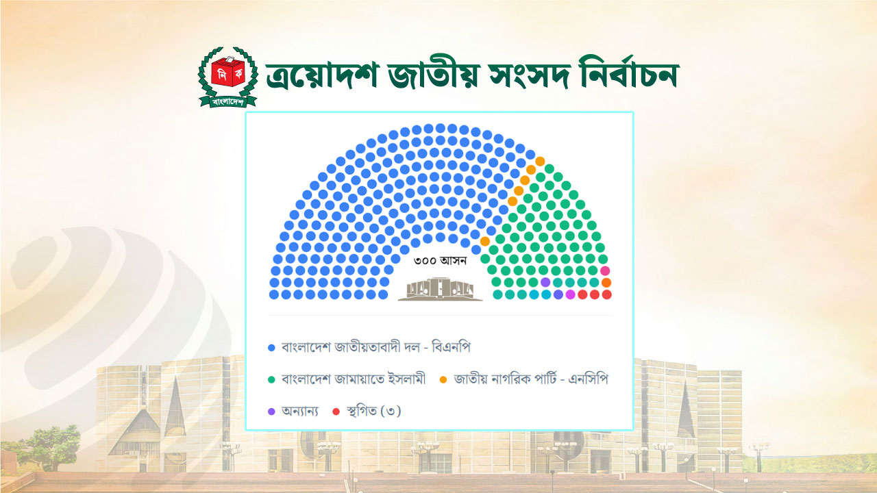 ২৯৯ আসনে ভোট হলেও এখন পর্যন্ত ফলাফল প্রকাশ করা হয়েছে ২৯৭টির। এর মধ্যে বিএনপি ২০৯, জামায়াতে ইসলামী ৬৮ ও জাতীয় নাগরিক পার্টি (এনসিপি) ছয় আসনে জয়ী হয়েছে।