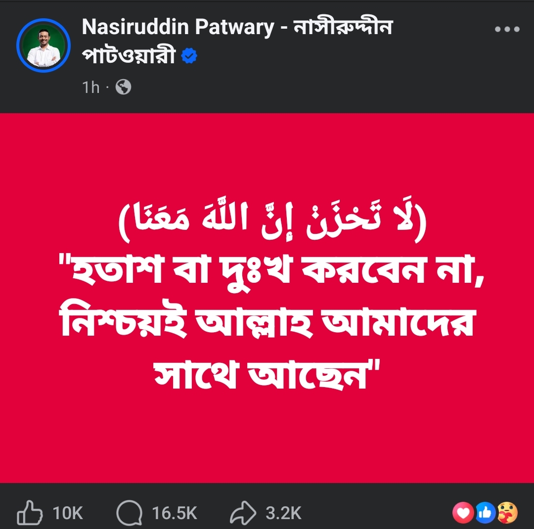 পোস্টে নাসীরুদ্দিন লিখেন, হতাশ বা দুঃখ করবেন না। নিশ্চয়ই আল্লাহ আমাদের সঙ্গে আছেন।