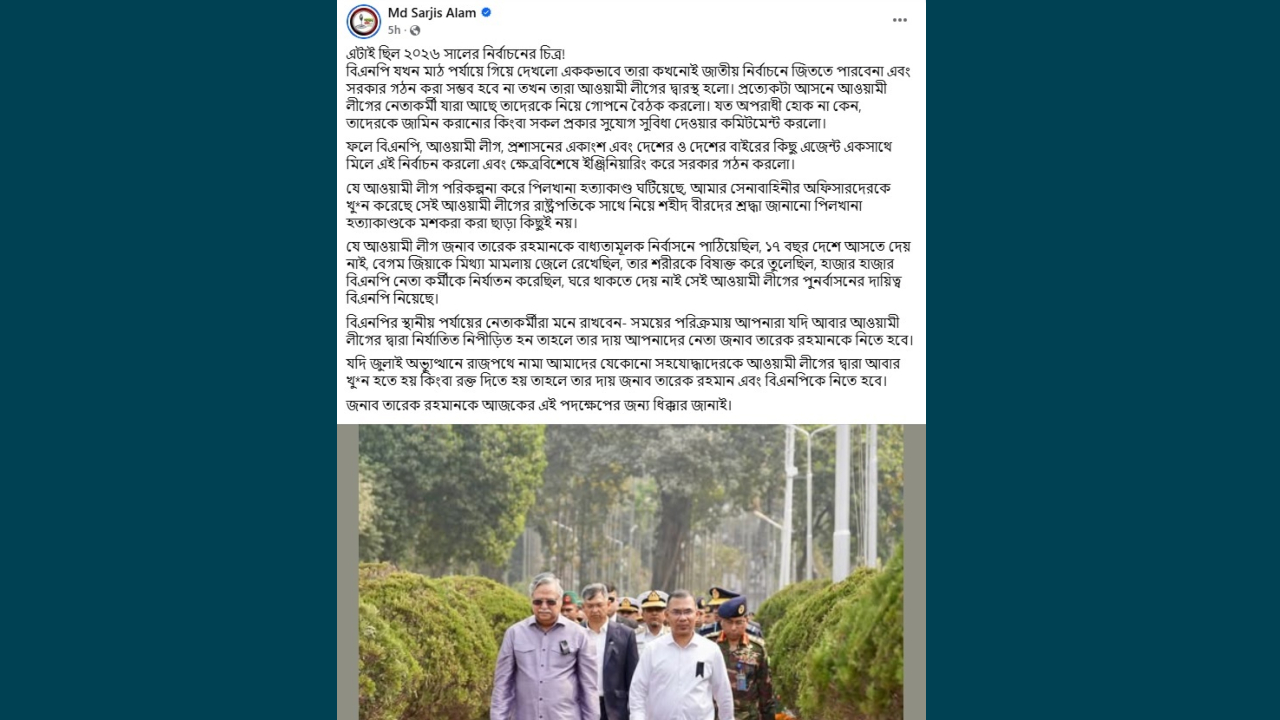 ‘জাতীয় শহীদ সেনা দিবস’ উপলক্ষ্যে আজ রাষ্ট্রপতি মো. সাহাবুদ্দিন ও প্রধানমন্ত্রী তারেক রহমান রাজধানীর বনানীর সামরিক কবরস্থানে শহীদ সেনা কর্মকর্তাদের প্রতি রাষ্ট্রীয়ভাবে গভীর শ্রদ্ধা জানিয়েছেন। সেখানকার একটি ছবি পোস্ট করে সারজিস আলম লেখেন, এটাই ছিল ২০২৬ সালের নির্বাচনের চিত্র! বিএনপি যখন মাঠ পর্যায়ে গিয়ে দেখল যে এককভাবে তারা কখনোই জাতীয় নির্বাচনে জিততে পারবে না এবং সরকার গঠন করা সম্ভব হবে না, তখন তারা আওয়ামী লীগের দ্বারস্থ হলো। প্রতিটি আসনে আওয়ামী লীগের নেতাকর্মীদের নিয়ে গোপনে বৈঠক করলো। তারা যত বড় অপরাধীই হোক না কেন, তাদেরকে জামিন করানো কিংবা সকল প্রকার সুযোগ-সুবিধা দেওয়ার প্রতিশ্রুতি দিল।