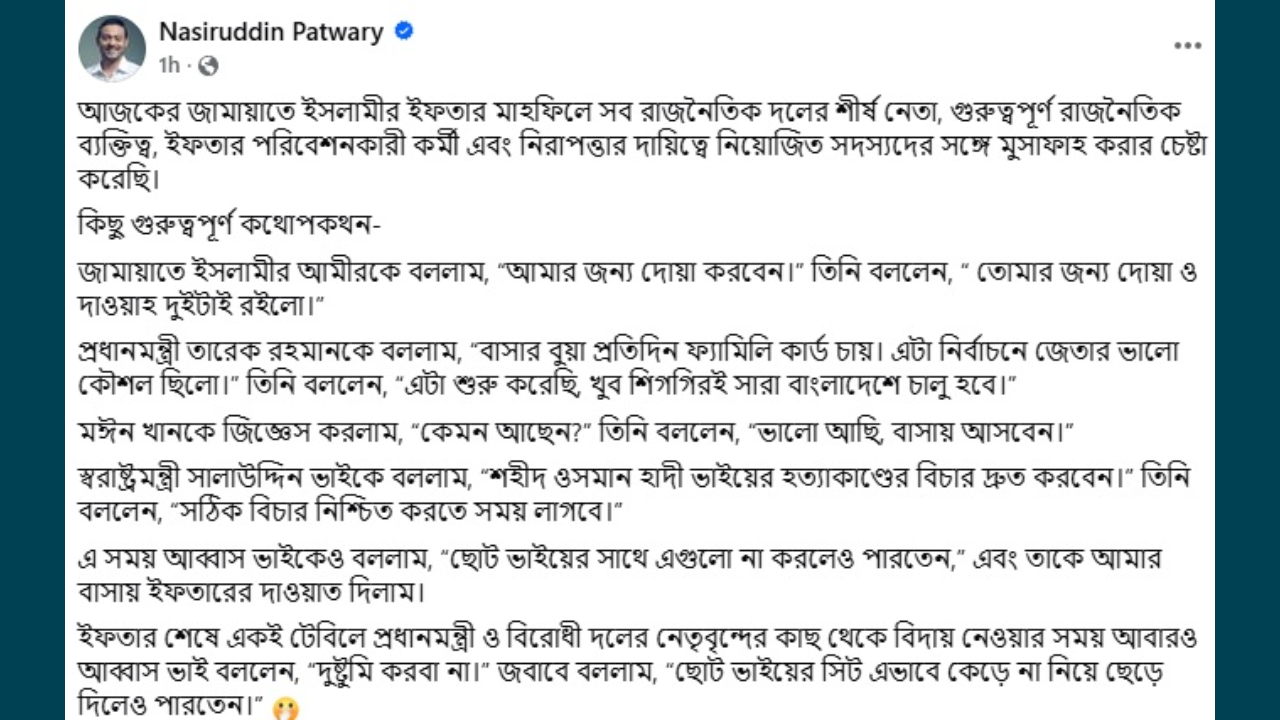 জামায়াতে ইসলামীর ইফতারে প্রধানমন্ত্রীসহ বিভিন্নজনের সঙ্গে কথোপকথনের অভিজ্ঞতা তুলে ধরেছেন জাতীয় নাগরিক পার্টির (এনসিপি) মুখ্য সমন্বয়ক নাসীরুদ্দীন পাটওয়ারী। সেখানে প্রধানমন্ত্রীর উপদেষ্টা ও ঢাকা-৮ আসনের সংসদ সদস্য মির্জা আব্বাস তাকে ‘দুষ্টুমি’ করতে নিষেধ করেছেন বলেও জানান নাসীরুদ্দীন পাটওয়ারী।