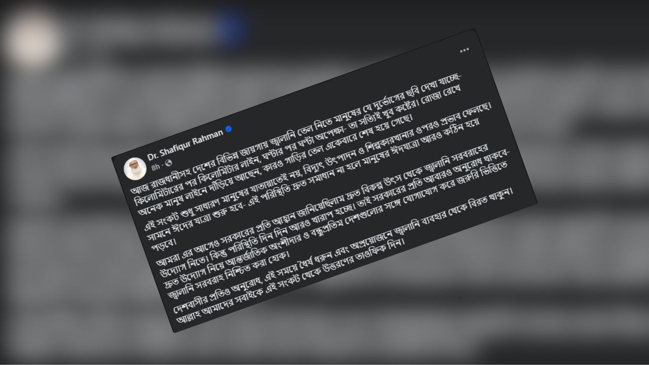 সংকটকালীন এই সময়ে দেশবাসীর প্রতি ধৈর্য ধারণের আহ্বান জানিয়ে শফিকুর রহমান বলেন, ‘এই সময়ে ধৈর্য ধরুন এবং অপ্রয়োজনে জ্বালানি ব্যবহার থেকে বিরত থাকুন। আল্লাহ আমাদের সবাইকে এই সংকট থেকে উত্তরণের তাওফিক দিন।’