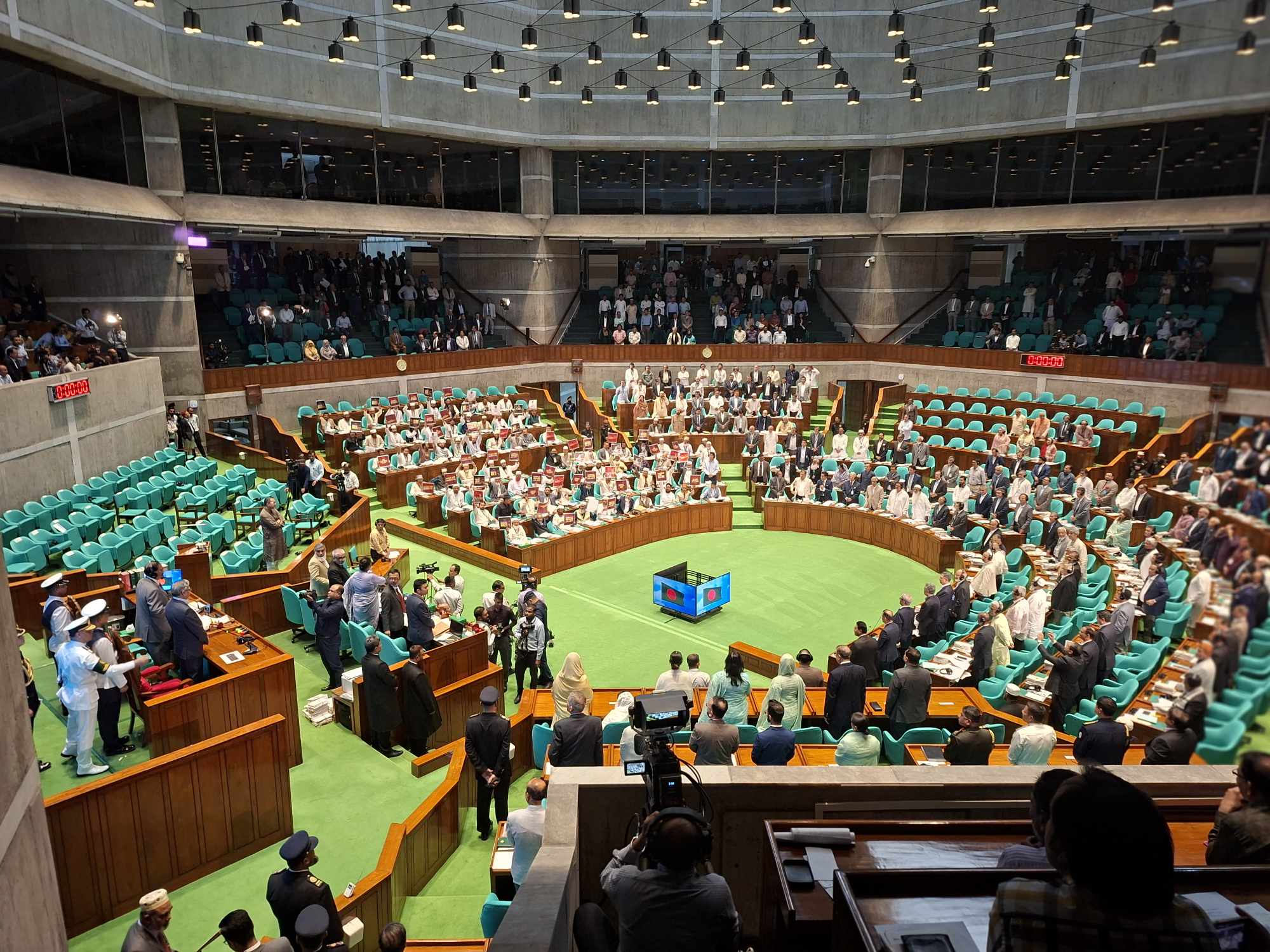 হট্টগোল, প্রতিবাদ, চিতকারের মধ্যেই রাষ্ট্রপতি সংসদের অধিবেশনে প্রবেশ করেন ও স্পিকারের পাশে বসেন। এসময় সংসদে হইচই করতে থাকেন বিরোধী দল জামায়াতের সংসদ সদস্যরা। তবে জাতীয় পতাকা উত্তোলন ও জাতীয় সঙ্গিত পরিবেশনার সময় চিৎকার-চেচামেচি বন্ধ করে সিট থেকে উঠে দাঁড়িয়ে যান তারা।