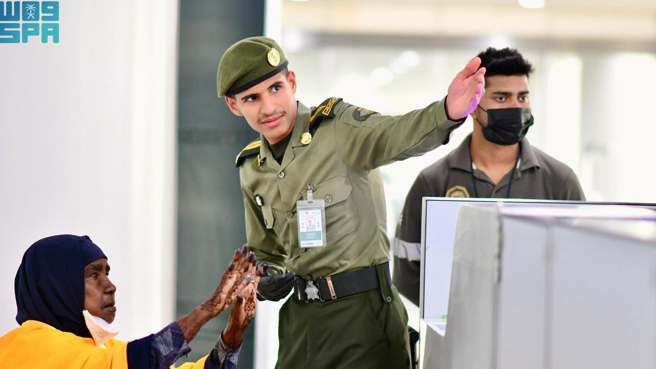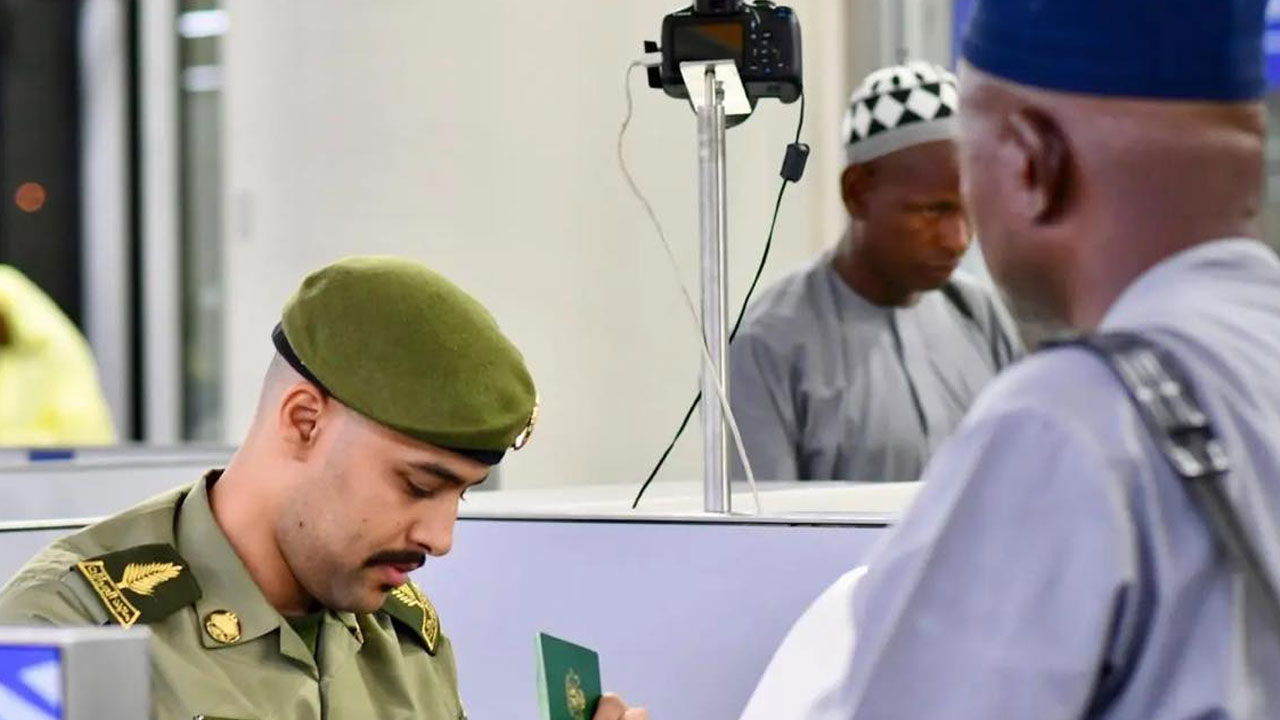 ছবিতে নাইজেরিয়া ও সোমালিয়ার হজযাত্রীদের স্বাগত জানানোর দৃশ্য—