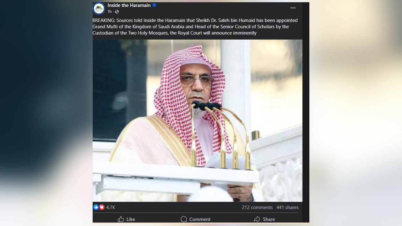 ইনসাইড দ্য হারামাইন বলছে, শায়খ ড. সালেহ বিন হুমাইদকে সৌদি আরবের গ্র্যান্ড মুফতি ও সিনিয়র ওলামা পরিষদের প্রধান হিসেবে নিয়োগ দেওয়া হয়েছে বলে সূত্র নিশ্চিত করেছে ইনসাইড দ্য হারামাইনকে। সৌদি রয়্যাল কোর্ট শিগগিরই এ সংক্রান্ত আনুষ্ঠানিক ঘোষণা দেবে।