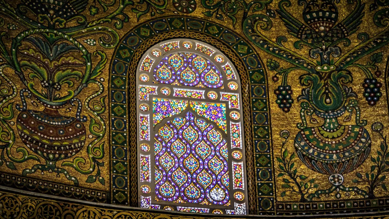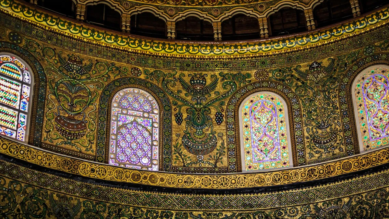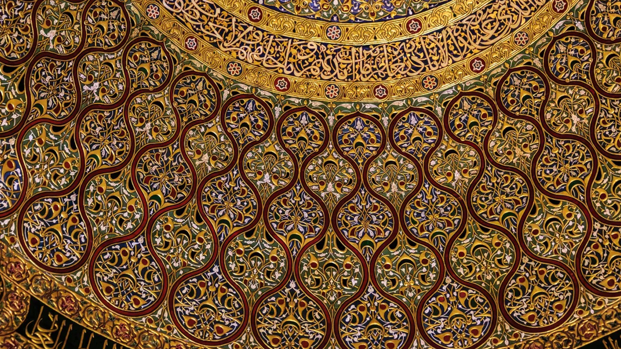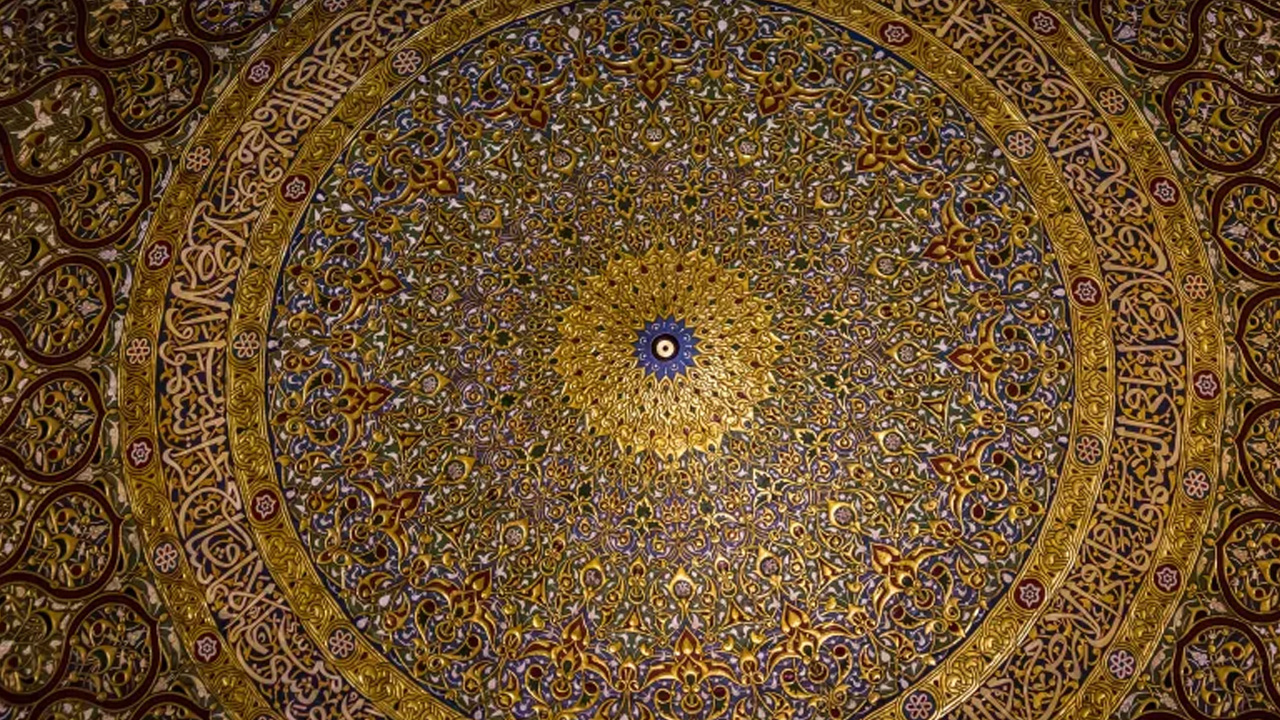 গম্বুজটির ভেতরের অলংকরণ; দক্ষ কারুশিল্পীদের হাতে তৈরি লেখা, ক্যালিগ্রাফি এবং সোনালি নকশা দেখতে কেমন তুলে ধরা হলো এখানে—