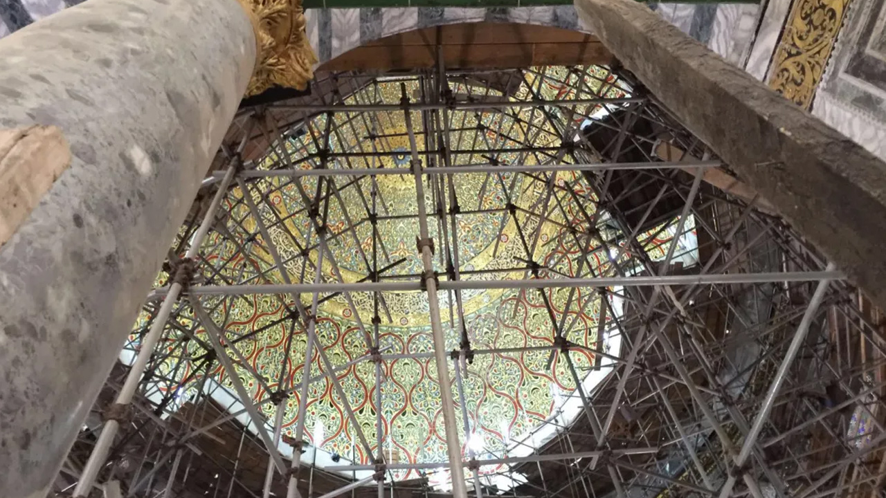 দুর্লভ সোনালী কাগজ ও মূল্যবান উপকরণ ব্যবহার করে কারিগররা গম্বুজটি সংস্কার করছেন।