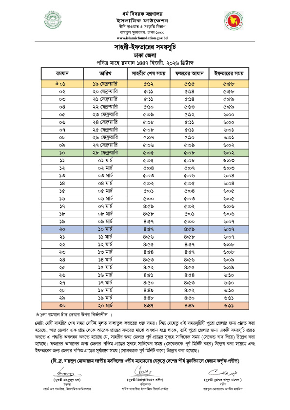 ইসলামিক ফাউন্ডেশন প্রকাশিত সারাদেশের সাহরি ও ইফতারের সময়সূচি দেখুন এখানে—