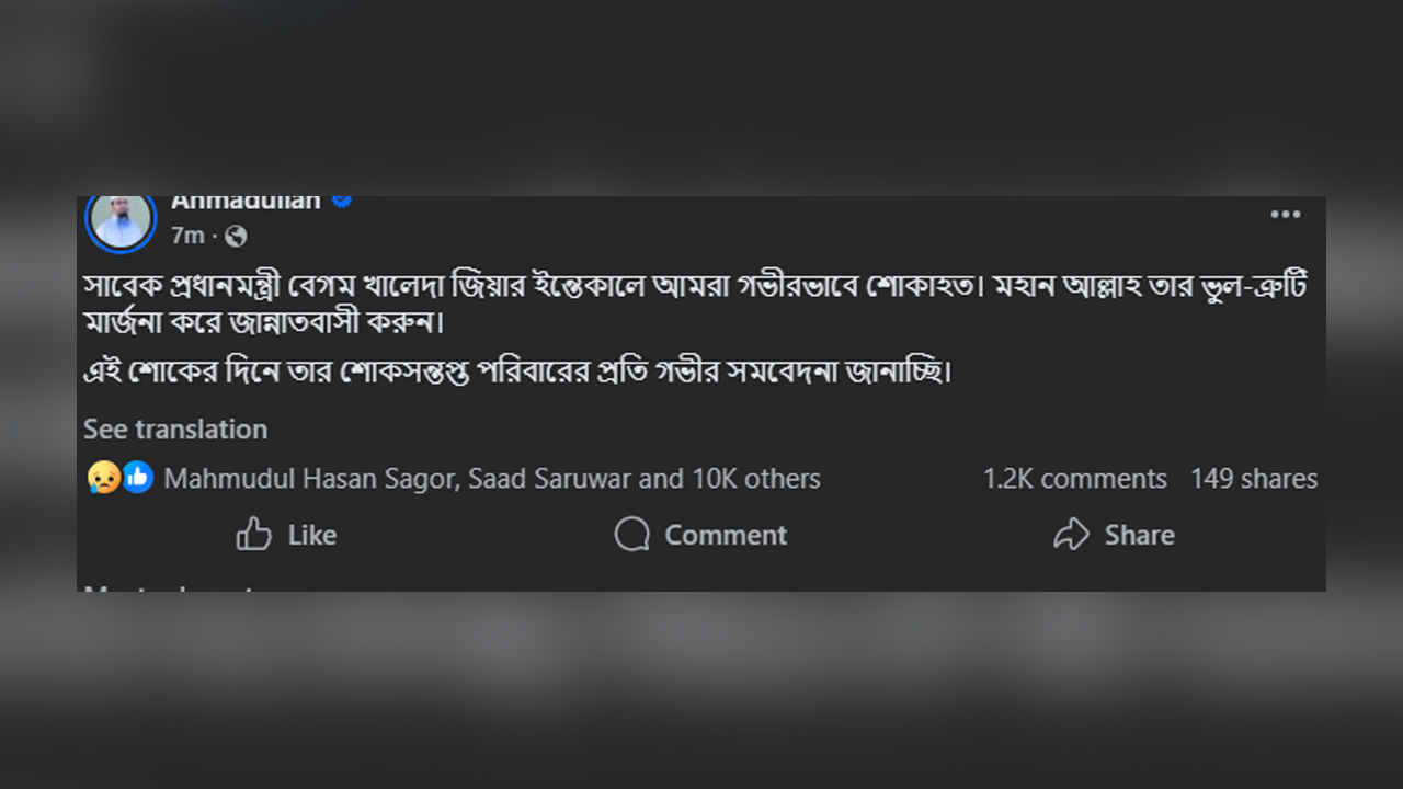 নিজের ভেরিফায়েড ফেসবুক পেজে তিনি বলেন,সাবেক প্রধানমন্ত্রী বেগম খালেদা জিয়ার ইন্তেকালে আমরা গভীরভাবে শোকাহত। মহান আল্লাহ তার ভুল-ত্রুটি মার্জনা করে জান্নাতবাসী করুন। এই শোকের দিনে তার শোকসন্তপ্ত পরিবারের প্রতি গভীর সমবেদনা জানাচ্ছি।