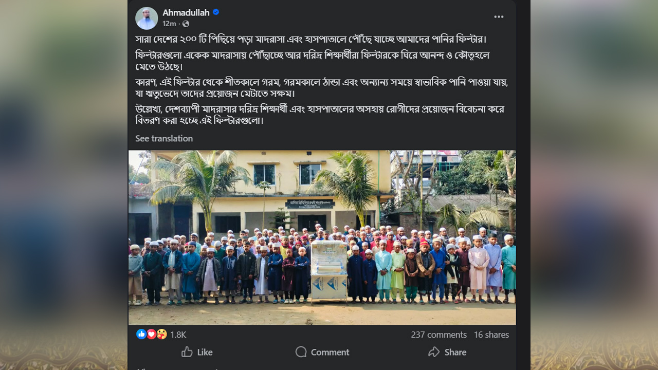 এক পোস্টে শায়খ আহমাদুল্লাহ জানান, সারাদেশের ২০০ টি পিছিয়ে পড়া মাদরাসা এবং হাসপাতালে পৌঁছে যাচ্ছে আমাদের পানির ফিল্টার।