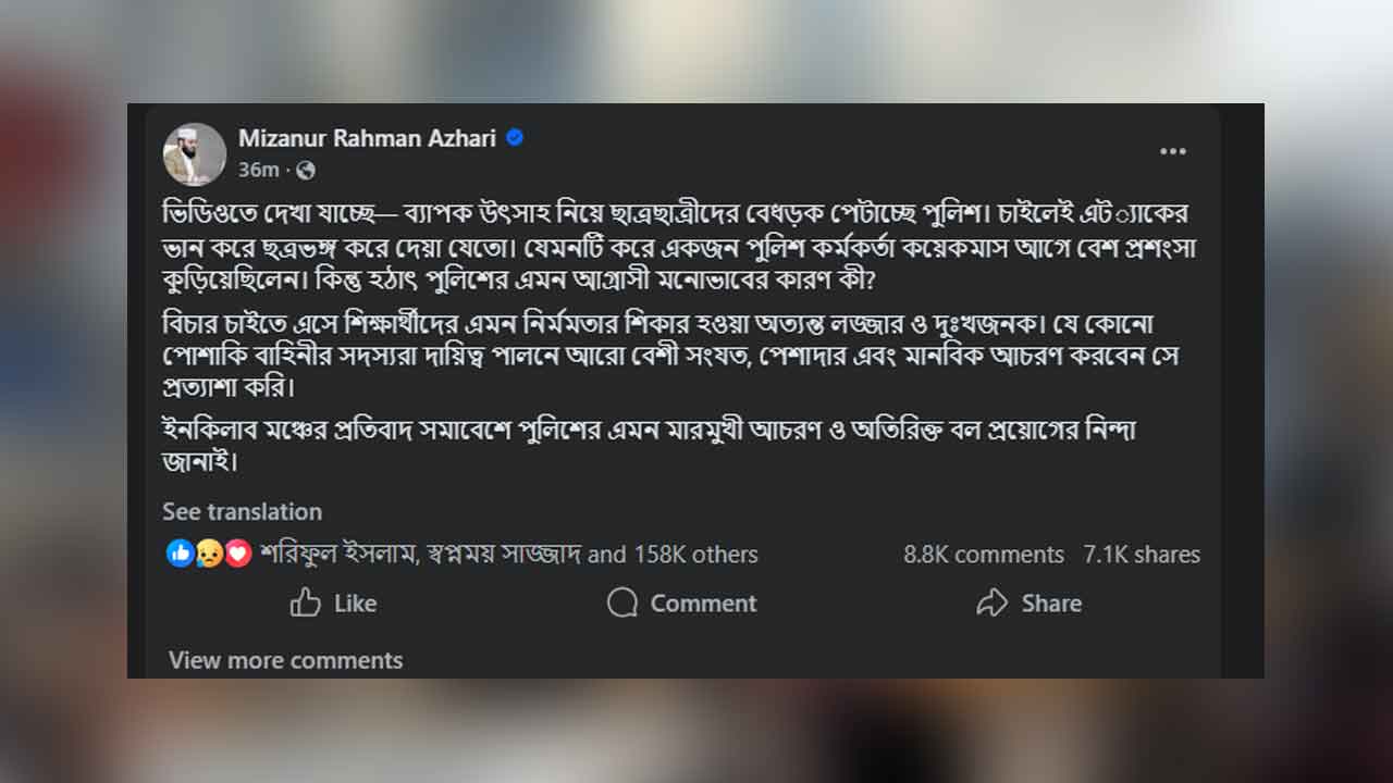 এ ঘটনার নিন্দা জানিয়েছেন জনপ্রিয় ইসলামী আলোচক মাওলানা মিজানুর রহমান আজহারী। নিজের ভেরিফায়েড ফেসবুক পেজে তিনি বলেছেন, ভিডিওতে দেখা যাচ্ছে— ব্যাপক উৎসাহ নিয়ে ছাত্রছাত্রীদের বেধড়ক পেটাচ্ছে পুলিশ। চাইলেই অ্যাটাকের ভান করে ছত্রভঙ্গ করে দেওয়া যেতো। যেমনটি করে একজন পুলিশ কর্মকর্তা কয়েকমাস আগে বেশ প্রশংসা কুড়িয়েছিলেন। কিন্তু হঠাৎ পুলিশের এমন আগ্রাসী মনোভাবের কারণ কী?