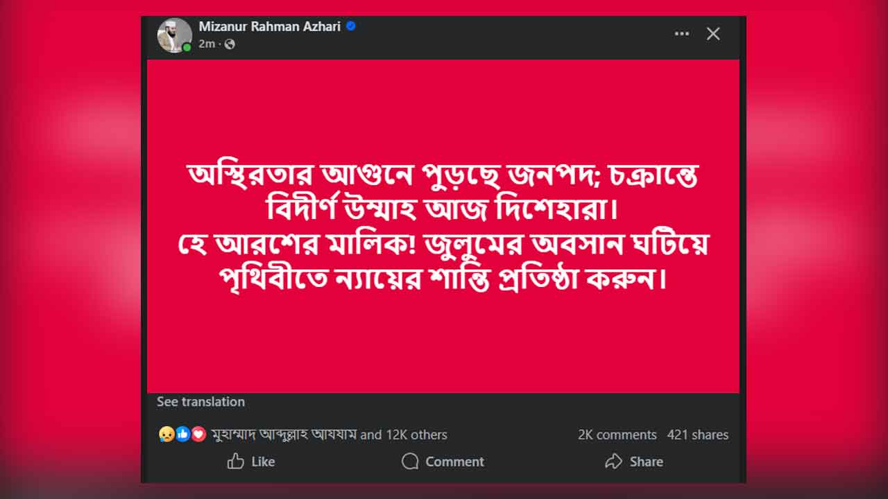নিজের ভেরিফায়েড ফেসবুক পেজে তিনি বলেন, অস্থিরতার আগুনে পুড়ছে জনপদ; চক্রান্তে বিদীর্ণ উম্মাহ আজ দিশেহারা।