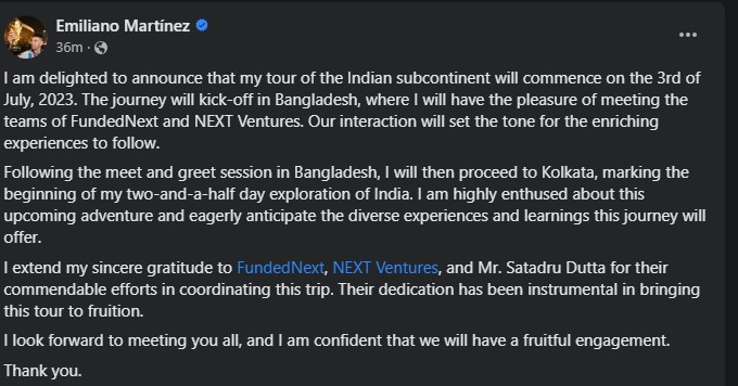 সামাজিকযোগাযোগ মাধ্যমে মার্টিনেজ লিখেছেন, 'আমি ঘোষণা দিতে পেরে আনন্দিত যে, ৩ জুলাই থেকে ভারতীয় উপমহাদেশে আমার সফর শুরু করবো। আমার যাত্রা শুরু হবে বাংলাদেশকে দিয়ে, যেখানে আমি ফান্ড নেক্সট এবং নেক্সট ভেঞ্চারস দলের সঙ্গে সাক্ষাত করবো।'