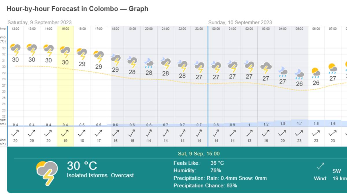 আর কলম্বোতে চলছে ভরা বর্ষার মৌসুম। বাংলাদেশ বনাম শ্রীলঙ্কা ম্যাচেও বৃষ্টি হানা দেবে এমন শঙ্কা আবহাওয়াবিদদের। পূর্বাভাস বলছে, দিনভরই বৃষ্টি হতে পারে কলম্বোতে। এমনকি ঝড়ের সম্ভাবনাও আছে। ম্যাচ শুরুর সময় আছে ৬৩ শতাংশ বৃষ্টির শঙ্কা। সন্ধ্যায় সেটা বেড়ে ৭৫ থেকে ৮৭ শতাংশ পর্যন্ত যেতে পারে।