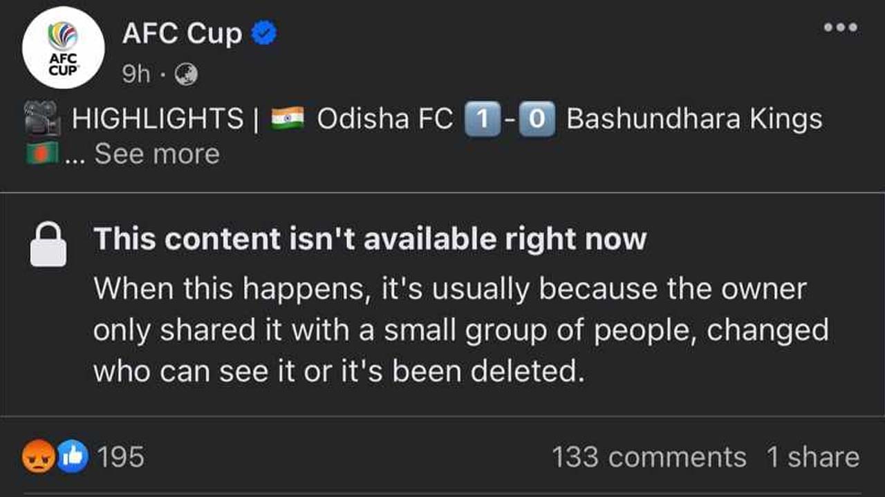 এশিয়ান ফুটবল কনফেডারেশনের এএফসি কাপ নামে একটি ফেসবুক পেজ রয়েছে। এই পেজে এএফসি কাপের প্রতি ম্যাচের হাইলাইটস প্রকাশ করে। এই পেজে গতকাল কিংস ও উড়িষাকে নিয়ে একটি পোস্ট হলেও সেই ম্যাচের হাইলাইটস ভিডিও নেই। গতকালকের অন্য ম্যাচগুলোর ভিডিও ঠিকই রয়েছে।