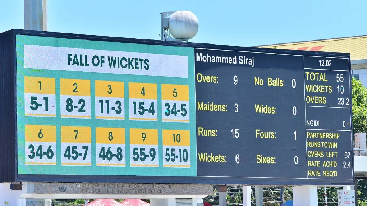 কেপটাউনে এদিন আগে ব্যাট করে ৫৫ রানে অলআউট হয় প্রোটিয়ারা। তাতে বেশ কিছু বিব্রতকর রেকর্ডও গড়েছে তারা। অতীতে ৫৫ রানের কমে আরও অন্তত ৭ বার অলআউট হয়েছিল দক্ষিণ আফ্রিকা। তবে ১৯৩২ সালের পর নিজেদের টেস্ট ইতিহাসে আজই সর্বনিম্ন সংগ্রহের রেকর্ড গড়ল ডিন এলগারের দল। সেবার অস্ট্রেলিয়ার বিপক্ষে মাত্র ৩৬ রানেই অলআউট হয় প্রোটিয়ারা। এ ছাড়া ভারতের বিপক্ষেও যে কোনো দলের সর্বনিম্ন রানের লজ্জার রেকর্ড এটি।