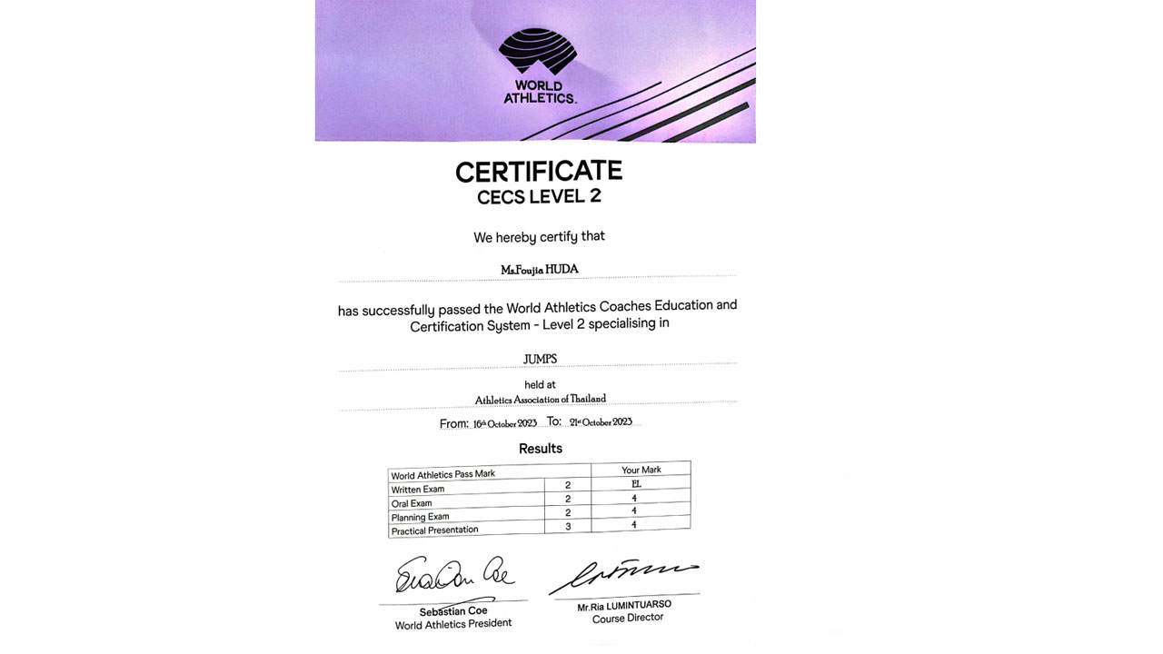সাবেক তারকা অ্যাথলেট ও বাংলাদেশ ক্রীড়া শিক্ষা প্রতিষ্ঠানের কোচ ফৌজিয়া হুদা জুই বিশ্ব অ্যাথলেটিক্সের লেবেল-২ কোচিং সনদ অর্জন করেছেন। ২০২৩ সালের অক্টোবরে থাইল্যান্ডে এক সপ্তাহের একটি কোর্সে অংশগ্রহণ করেন। সেই কোর্সের প্রতিটি মডিউলে তিনি সর্বোচ্চ নম্বর পেয়ে উত্তীর্ণ হয়েছেন।
