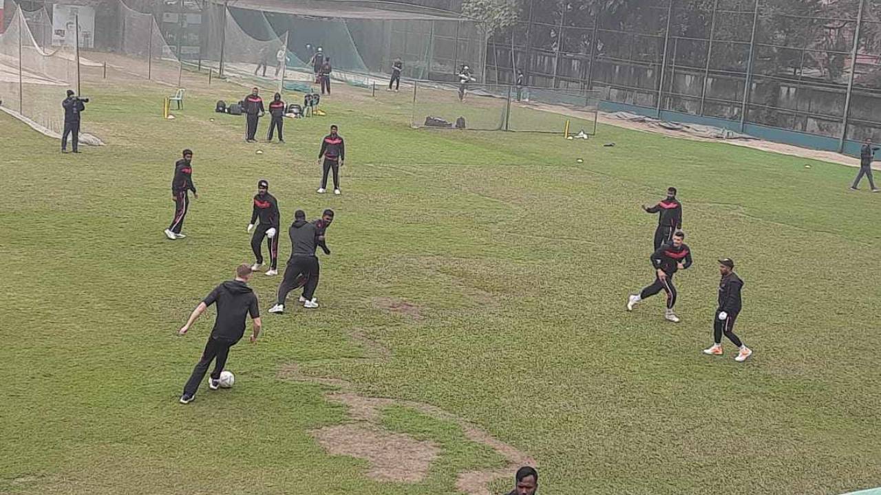 শীতের আড়মড়ে ভাব তখনো কাটেনি ক্রিকেটারদের মধ্যে থেকে। হ্যারি টেক্টর, বেন কাটিংরা কিছুটা সময় নেন অবস্থা বুঝতে। এরপর দুই দল ভাগ হয়ে ফুটবল অনুশীলন করেন ক্রিকেটাররা। মিনিট দশেকের মতো চললো গা গরম করা এই ফুটবল ম্যাচ। এরপর ক্যাচ অনুশীলন করতেও দেখা গেল শান্ত-জাকিরদের।